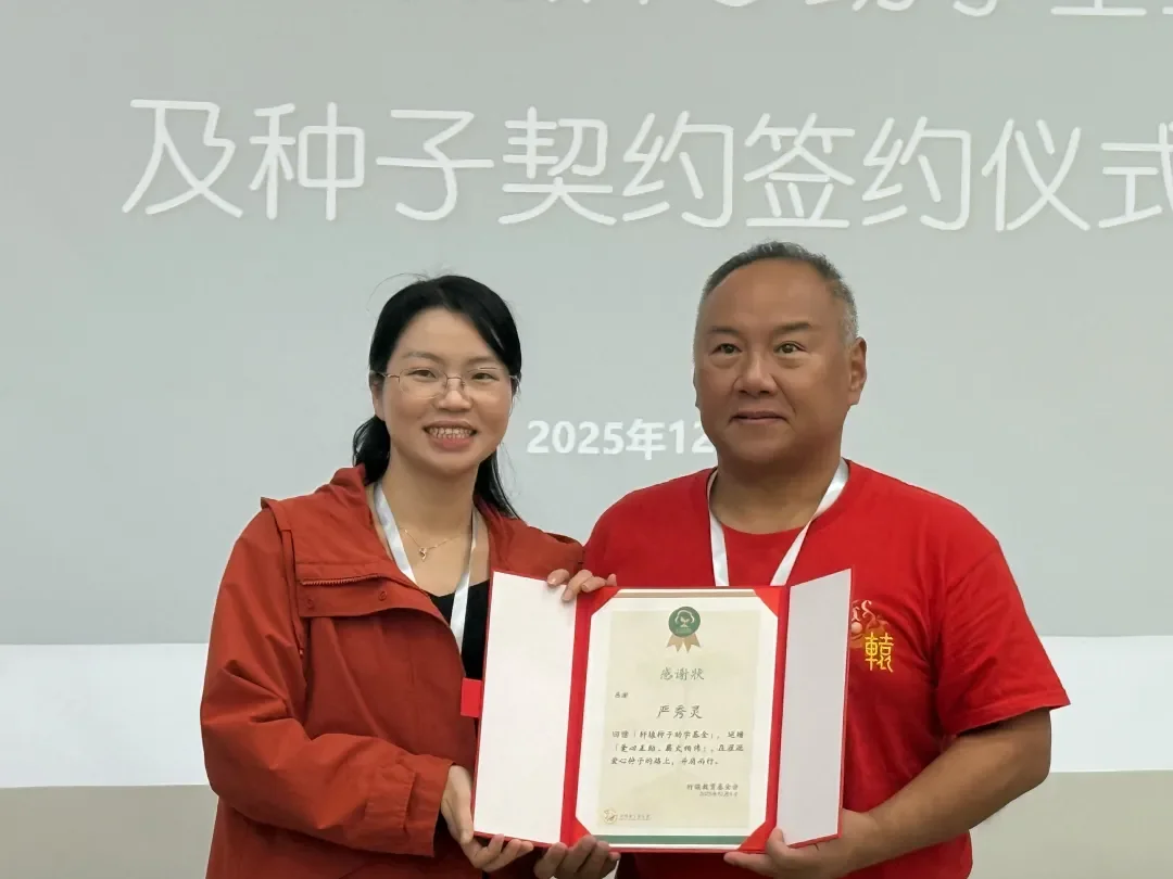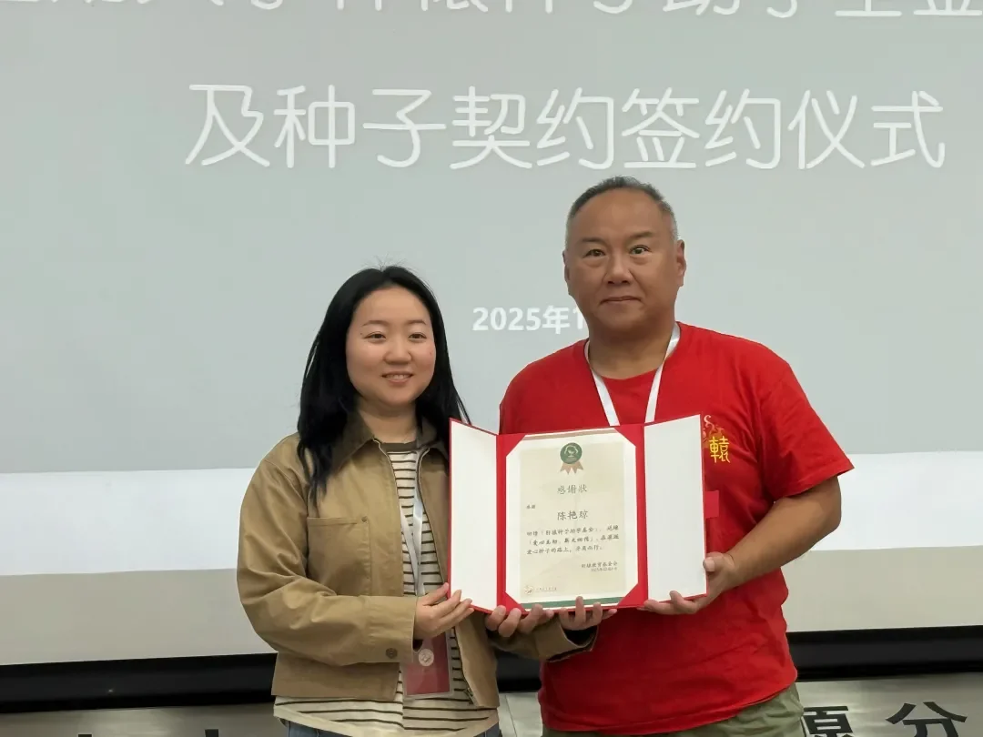 曾京向陈艳琼、严秀灵颁发“种子回馈者”感谢状