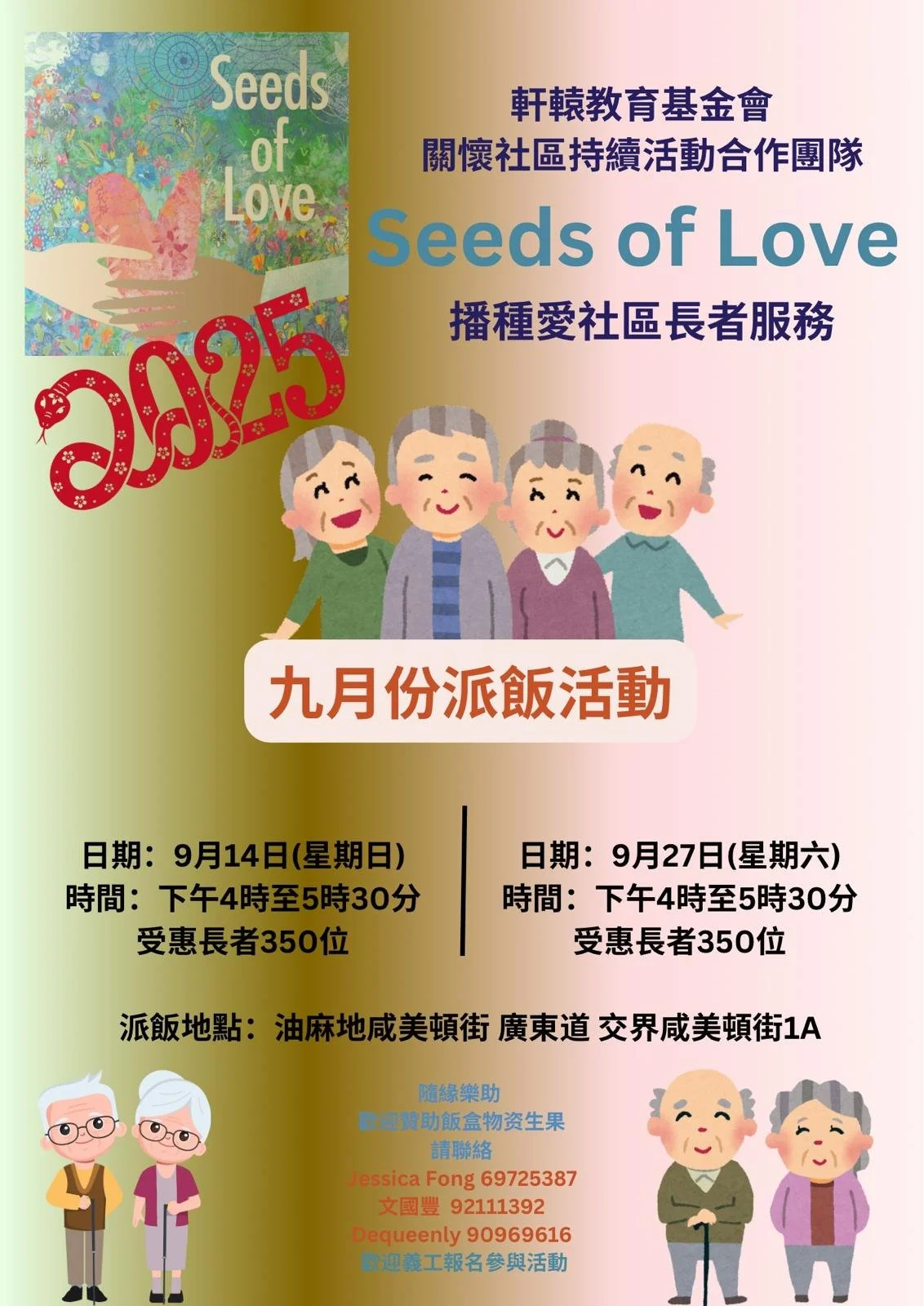2025年9月27日 - 播種愛・社區長者服務 播種愛 Sep 27 Written By Xuan Yuan 27/9受惠長者358人 今日臨時爺爺嫲嫲带了兩位可爱的孩子,好似帶給了陽光給大家,孩子說下次要再來😍 派飯活動社區關懷播種愛社區長者服務20259月 Xuan Yuan https://www.xuanyuan.hk